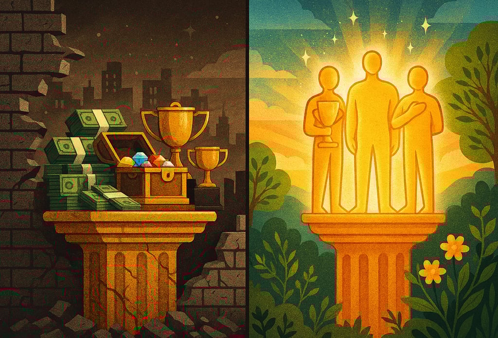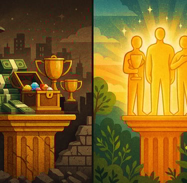 Psychological Conditioning: From childhood, rewards (grades, gifts, praise) often outweigh intrinsic motivations (curiosity, kindness, creativity). Over time, people internalize the belief that external rewards are the ultimate measure of high value.